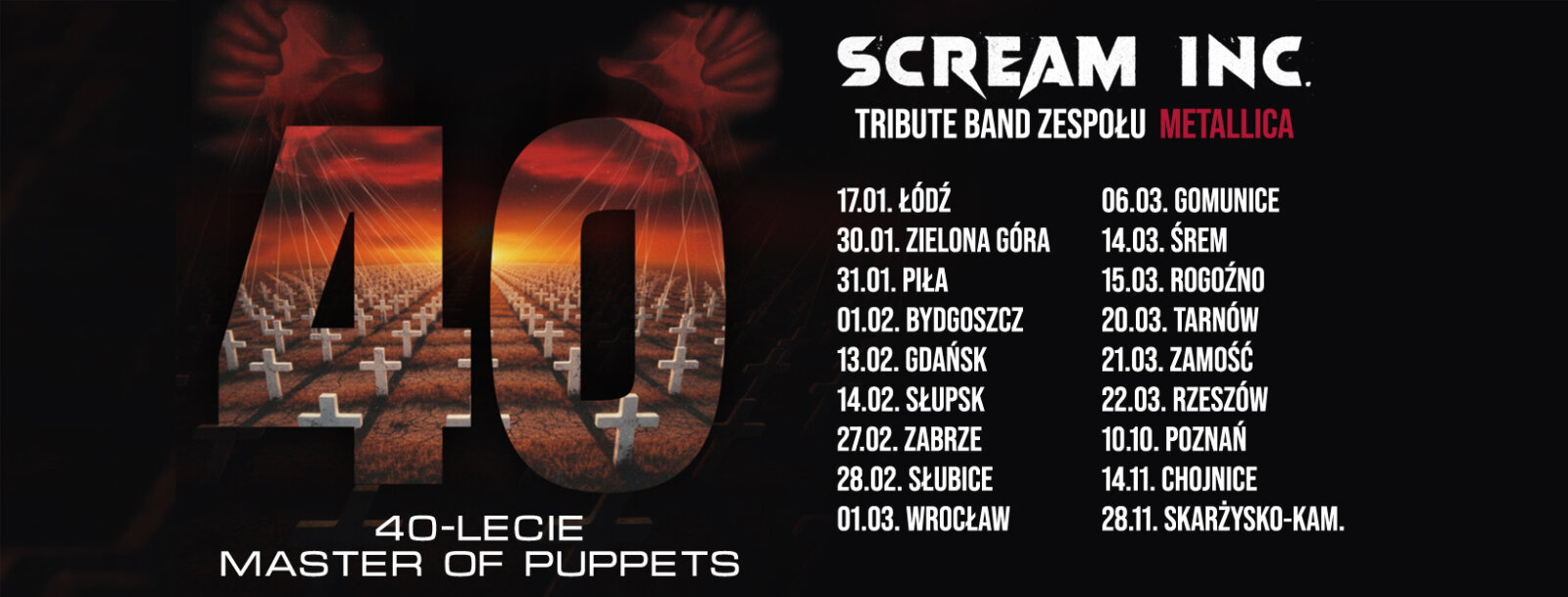 Z okazji jubileuszu tego kultowego wydawnictwa, Scream Inc. – jeden z najlepszych tribute bandów legendarnej Metalliki – wyrusza w europejską trasę koncertową. Cały 2026 rok upłynie pod znakiem celebracji „Master of Puppets”, podczas której zespół zaprezentuje album w całości, zachowując charakterystyczne brzmienie, aranżacje i energię oryginału. W programie znajdą się również inne klasyki Metalliki – od pierwszych riffów po największe hity kolejnych dekad.